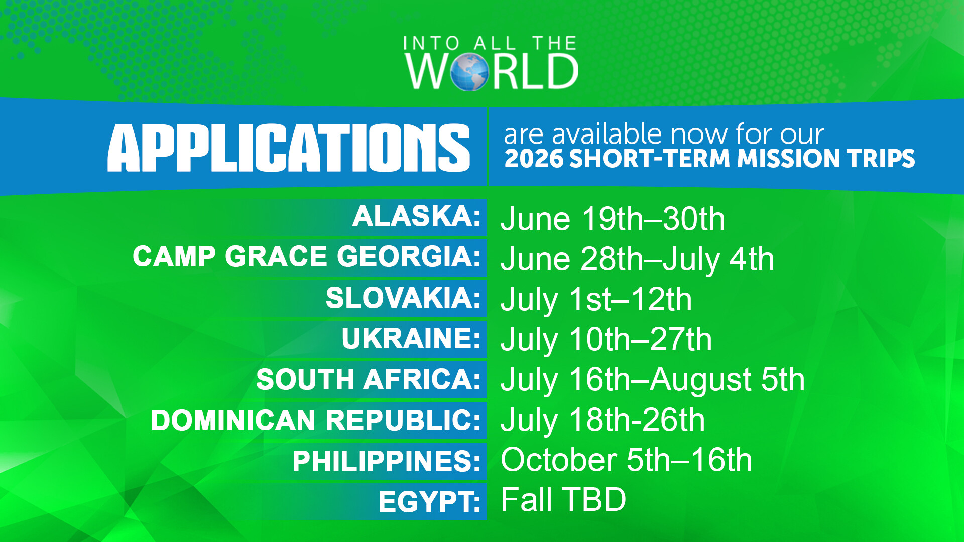 In 2026 we once again have the opportunity to go and be witnesses in many different parts of our country and world. We are excited to be adding new trips this year to the Dominican Republic and Egypt. For all information and to apply, click here to download our short term mission application.
